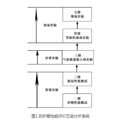 防化服的性能評價主要包含防護(hù)性能以及舒適性2個方面。目前成熟的評價體系是五級分析系統(tǒng),如圖1所示。可以劃分為客觀評價、人體穿著實驗以及現(xiàn)場實驗3個層次。