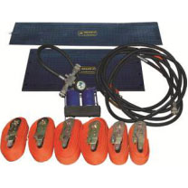 ·捆綁式堵漏袋主要應用于圓形管道以及圓形容器裂縫的堵漏作業(yè)。使用時,通過向袋體內(nèi)充氣使袋體膨脹對泄漏處進行封堵。主要由袋體、收緊裝置、腳踏泵、減壓器及安全控制器組成。