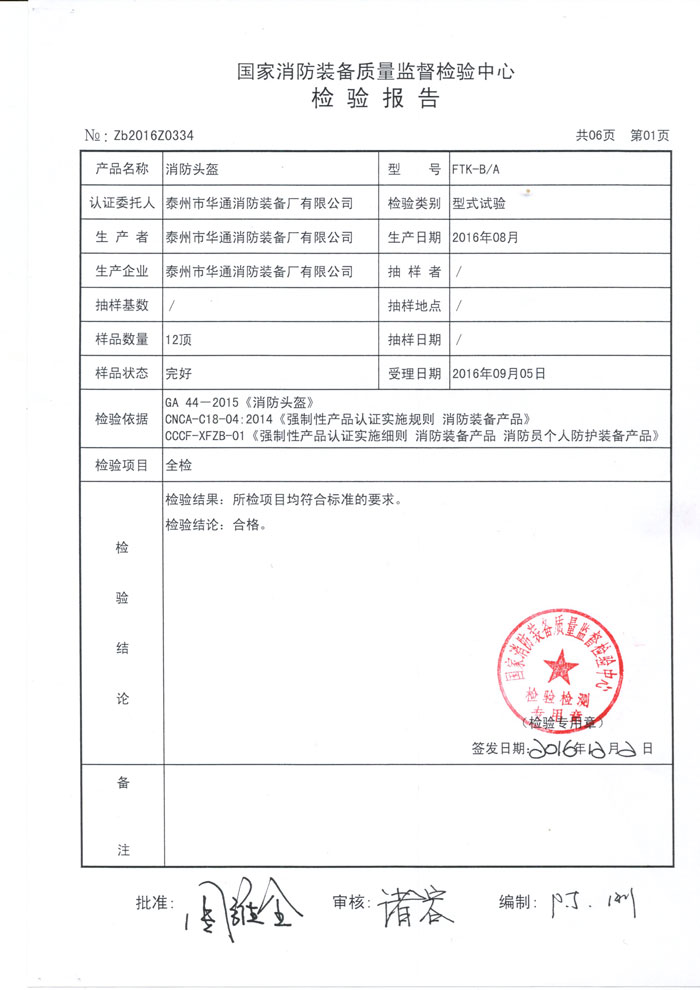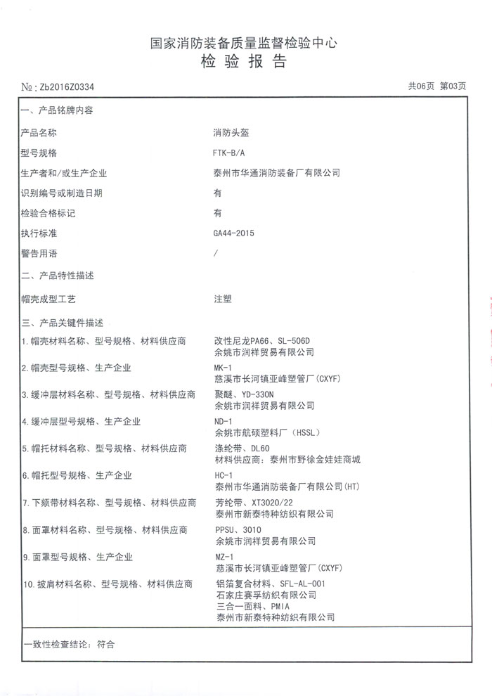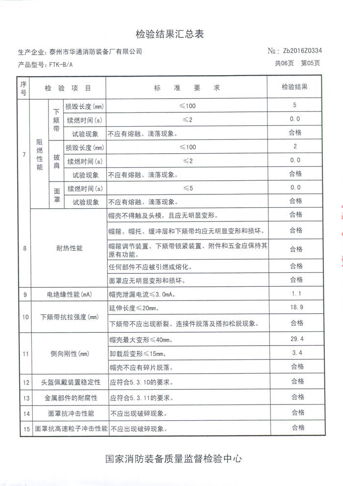 華通消防新型消防頭盔FTK-B/A符合GA44-2015標(biāo)準(zhǔn),CNCA-C18-04:2014《強制性產(chǎn)品認(rèn)證實施規(guī)則 消防裝備產(chǎn)品》,CCCF-XFZB-01《強制性產(chǎn)品認(rèn)證實施細(xì)則 消防裝備產(chǎn)品 消防員個人防護(hù)裝備產(chǎn)品》。沖擊吸收性能:最大沖擊力≤3780N,帽殼沒有碎片脫落,帽托亦沒有損壞和斷裂,帽箍于帽殼的連接機構(gòu)沒有損壞和斷裂。抗沖擊加速度性能:帽頂部最大沖擊加速度≤150gn;帽前部最大沖擊加速度≤400gn;帽側(cè)部最大沖擊加速度≤400gn;帽后部最大沖擊加速度≤400gn。耐燃燒性能在火源離開帽殼后,帽殼火焰在5s內(nèi)自熄,沒有火焰燒透到帽殼內(nèi)部跡象,帽殼沒觸及頭模,且無明顯變形,帽箍、帽托、緩沖層和下頦帶均無明顯變形和損壞,任何部件都無被引燃或融化。